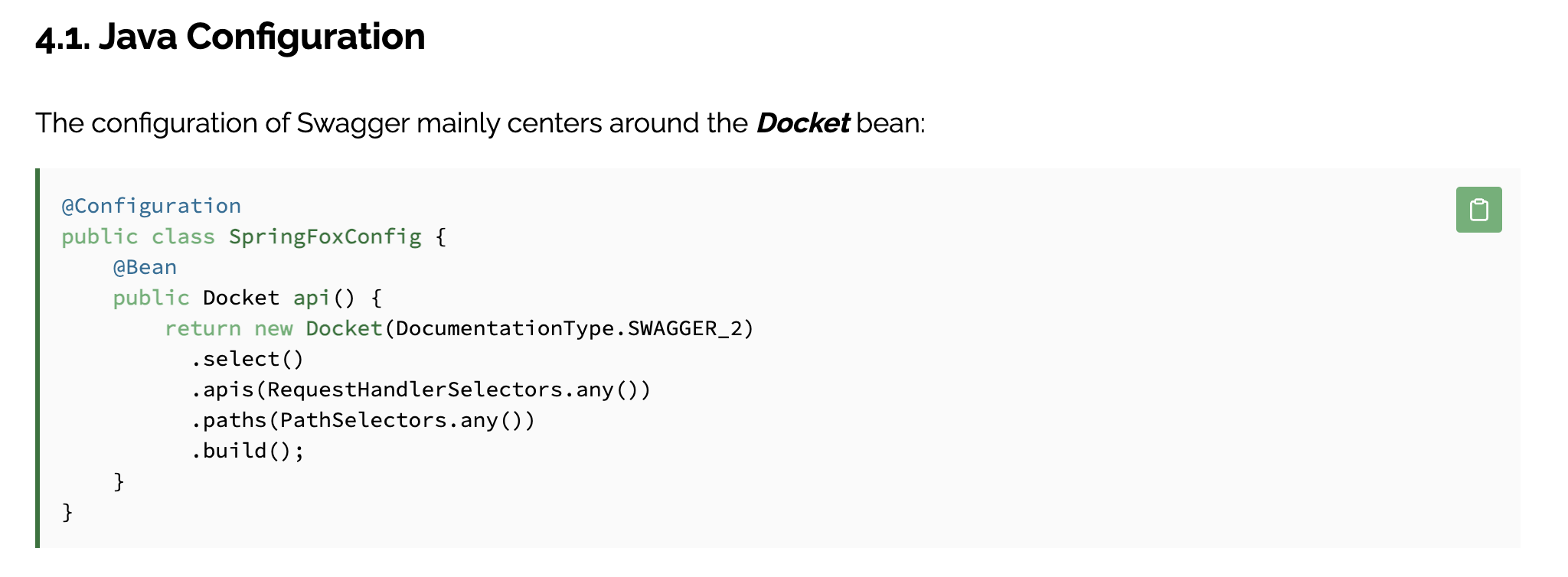 이후 Docket bean을 만들어줘야 되는데, Baeldung에서 가져온 공식문서이다. 스프링 부트 버젼에 따라 configuration 차이가 생기는 부분인데, 지금 프로젝트에 쓰고 있는 2.7.x 버젼에서 다음과 같은 에러가 비슷하게 뜬다.